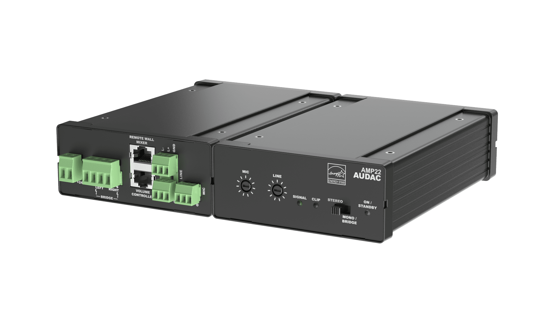 Miniaturní mixážní zesilovač 30W (RMS) s možností provozu v režimu stereo / mono, digitální topologie Class-D s vysokou účinností přes 80%, automaticky aktivovaný Standby režim při absenci audio signálu se spotřebou energie <1W, certifikace Energy Star, pasivní chlazení pro bezhlučný provoz. 1x stereofonní symetrický vstup Line (-12~+12dBV) + 1x symetrický vstup Mic (-50~-18dBV) s individuálním nastavením vstupní úrovně, 1x vstup RJ45 pro volitelný přípojný panel WP523, 1x vstup RJ45 pro volitelný externí ovladač hlasitosti VC3208, 2x LED indikace přítomnosti signálu a max. vybuzení, 1x 3stavová LED indikace napájení a pohotovostního režimu. Zkreslení THD+N <0,1%, odstup S/N >95dB, přeslech <-75dB (@1kHz), ochrana proti zkratu / přetížení / přehřátí / ss napětí na výstupu. Napájení 24VDC, součástí dodávky spínaný zdroj 100~240VAC / 47~63Hz. Možnost instalace na plochu nebo do 19\" racku pomocí volitelných montážních úchytů MBS1xx. Rozměry (ŠxVxH) 108x44x165mm, hmotnost 0,8kg včetně zdroje.